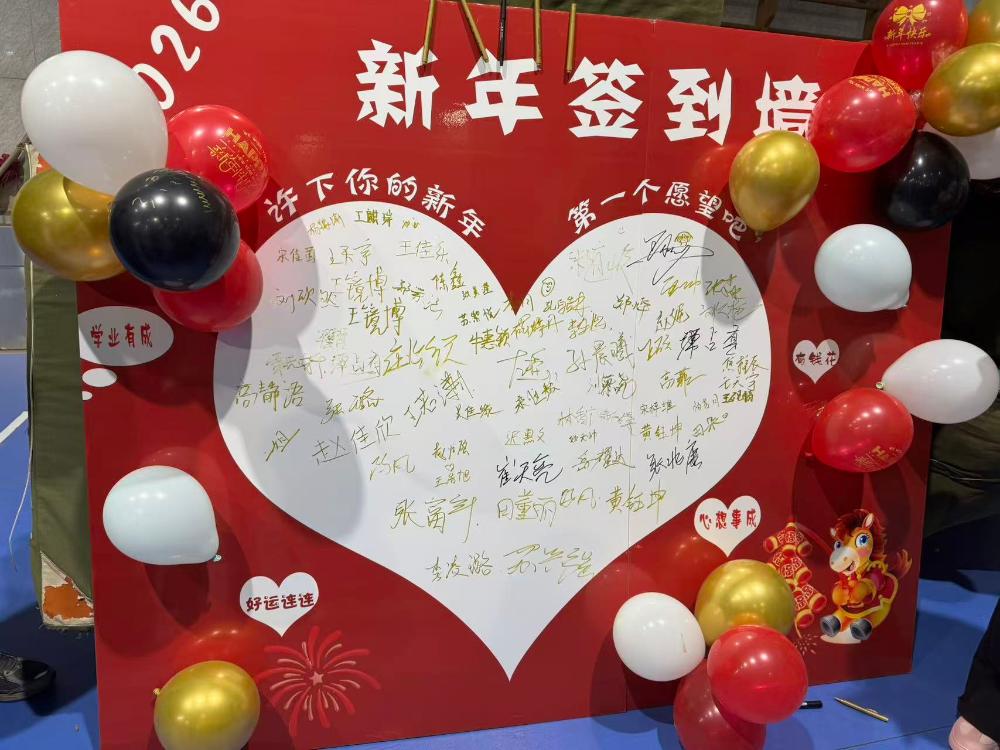 活动现场节日氛围浓厚。元旦主题签到墙前人流如织,红灯笼、金福字与彩带交织出浓郁的新年气象。同学们纷纷执笔写下新年寄语,贴上心愿贴,或合影留念,用一张张笑脸定格对2025年的美好期待。完成签到后,大家手持游园兑换券,兴致盎然地开启游戏之旅。