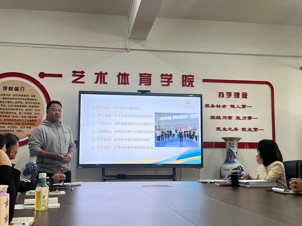 休闲体育专业由冰雪教研室主任王冰雪老师以《拓展训练》为例,提出 “从活动体验到能力生成” 思路。他指出传统课程 “重形式、轻实效” 致学生实践能力不足,强调 OBE 理念需以“逆向倒推”为核心,从岗位能力反向设计教学与评价;通过“帐篷搭建实践”“高空项目反思”等课程内容案例,展示“体验—讨论—整合—行动”闭环模式,并要求依布鲁姆认知目标分层设计任务,落实“以学生为中心”。