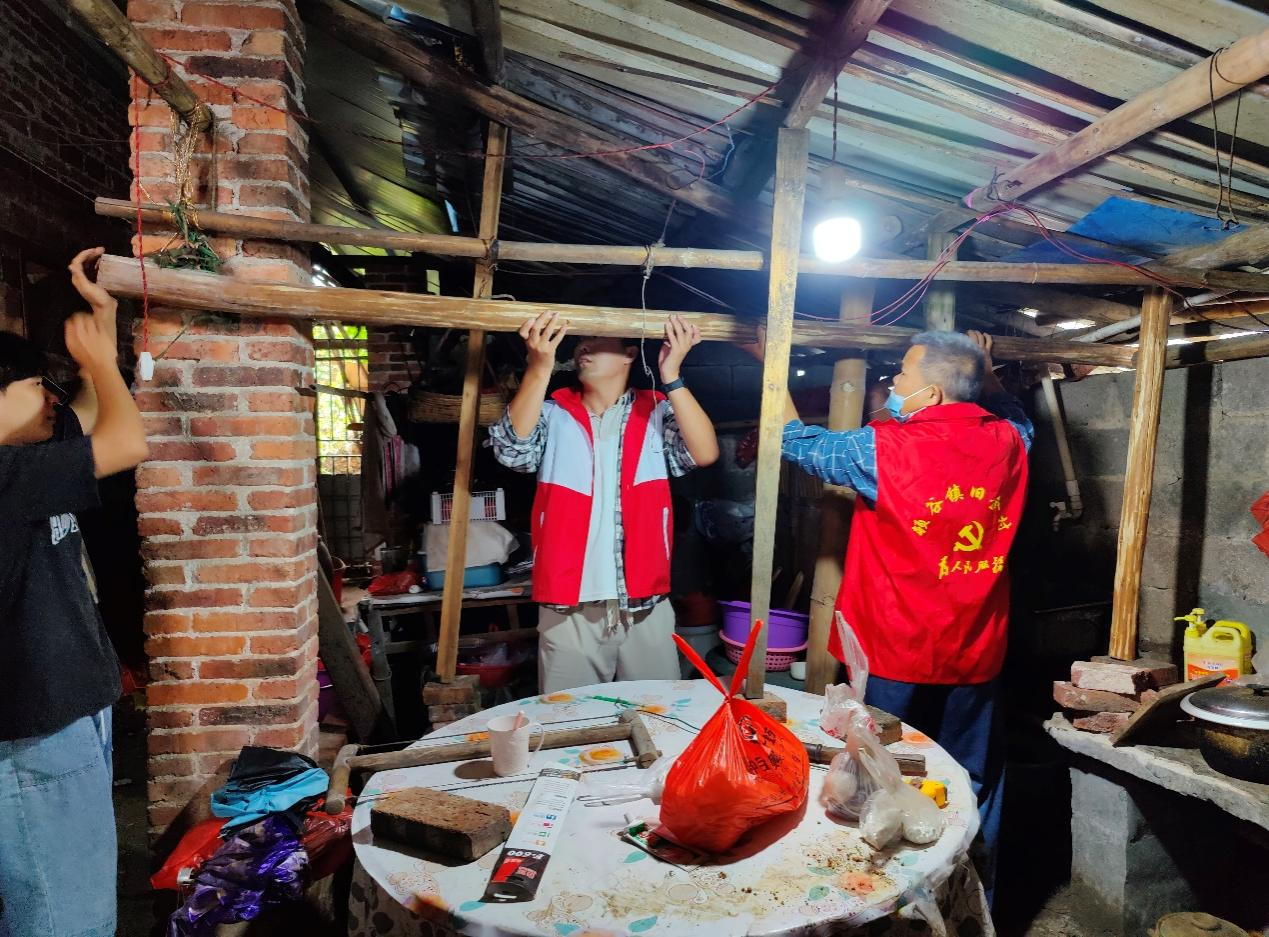 连续的阴雨天气,造成脱贫户宾某户厨房一根房梁竖向出现裂纹,存在安全隐患,作为其帮扶人和驻村第一书记,谢晓雷对此非常重视,主动联系村干部,再次入户查看具体情况,认为确实存在严重的安全隐患,组织研究解决办法,第一时间对安全隐患进行解决,经过一个小时的努力,成功将存在安全隐患的房梁换掉,为其更换新的房梁,正是这种行动践行才能更好的让党员的正能量映射到家家户户,让群众真切感受到基层党组织在为民办实事、为民办好事的决心和行动力。