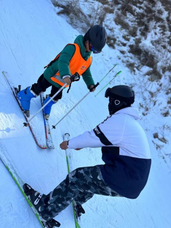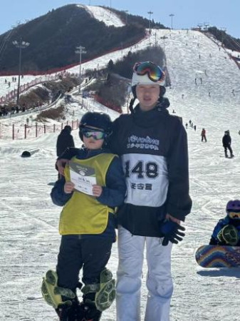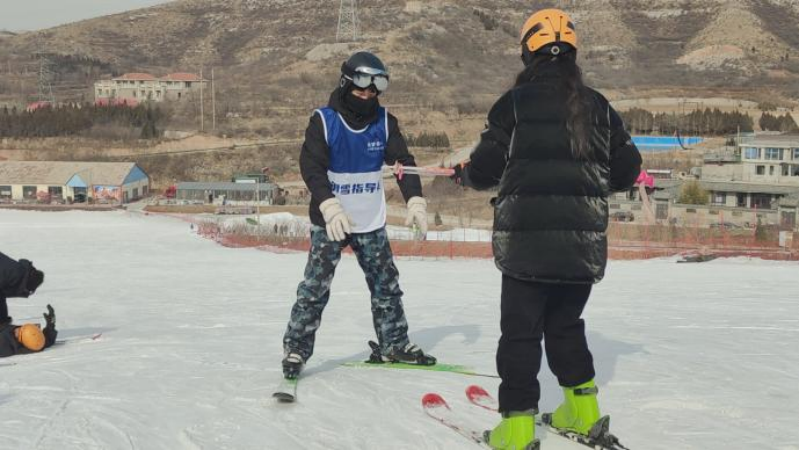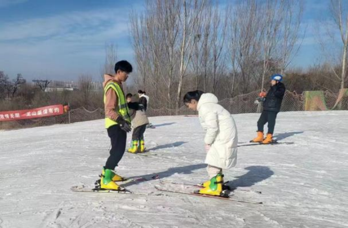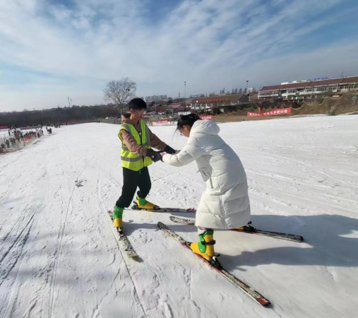 2. 2022级休闲体育二班贾子群在唐山市遵化龙山滑雪场担任滑雪教练一职,利用所学技能,指导初学者学习滑雪技能。
