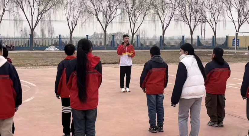 3.2023级休闲体育专业贾文博同学在河北省沧州市东光县大单镇果头小学教学实践,对学生进行田径技术动作指导。