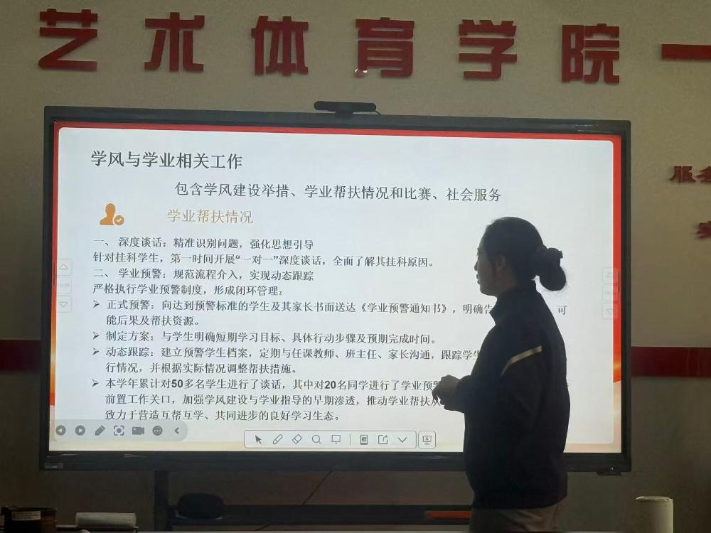 本次考核汇报会既是对过去一年学院学生工作与辅导员个人履职情况的集中检阅,也是一次深入的工作交流与经验分享。艺术体育学院将以此次考核为契机,持续加强辅导员队伍的专业化、职业化建设,不断优化学生工作体系,推动学院学生思想政治教育与管理工作再上新台阶,为学校高质量发展和高素质艺术体育人才培养贡献更大力量。
