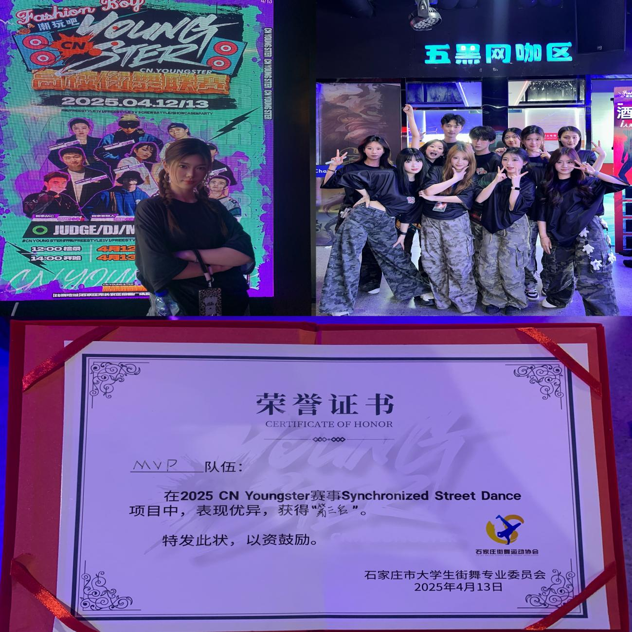 2025年4月13日,备受瞩目的石家庄大学生CN Youhgster街舞比赛圆满落幕。在这场汇聚了各地顶尖街舞团队的盛大赛事中,我校艺术体育学院2023级表演(体育表演)专业的郭艺昕同学,与学校MVP街舞社团的成员们凭借精彩绝伦的齐舞表演脱颖而出,荣盛齐舞比赛第三名的佳绩,为观众带来了一场视觉与听觉的双重盛宴。