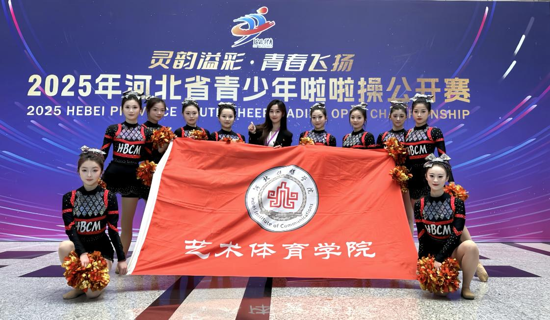 2025年4月19 - 21日,由河北省体育局体操举重柔道运动中心、河北省体操协会联合主办的2025年河北省青少年啦啦操公开赛在石家庄市人民会堂盛大举行。本次比赛吸引了来自全省近130支参赛队伍、3200余名青少年选手报名参赛 ,规模空前。河北传媒学院艺术体育学院郭佳慧老师带领的河北传媒学院啦啦操队表现出色,队内10名来自2022和2023级表演(体育表演)专业的学生表现出色,荣获公开青年甲组-小集体花球规定动作(2020版)-4级冠军。