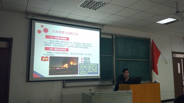 此次讲座由我院辅导员樊广源老师主讲。樊老师曾在安全工作处工作多年,他从消防安全的各个方面进行了讲解,并通过一个个案例让大家深刻认识到火灾的危害。在大学校园中,宿舍是火灾易发场所之一。因宿舍用电量较大,如果学生再私接电线、使用大功率电器更会引起火灾的发生。樊老师要求同学们千万不要为了一时便利而酿成大错,要时刻谨记安全最重要。关于消防器材设施的使用,樊老师在讲座现场演示了灭火器的正确使用方法。最后,樊老师对火灾逃生自救的姿势、路线进行讲解。
